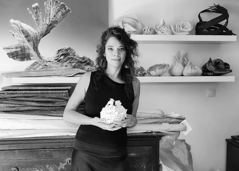 Kinga Földi, a Budapest-based textile sculptor from Hungary, creates intricate silk sculptures that celebrate the beauty of nature. She began her artistic journey by collecting and assembling found fabric pieces, which eventually led her to pursue formal studies at the renowned Moholy Nagy University of Art and Design. Her time there equipped her with diverse techniques, such as bobbin lace-making and origami, but it was the pin-tuck method that truly defined her style.