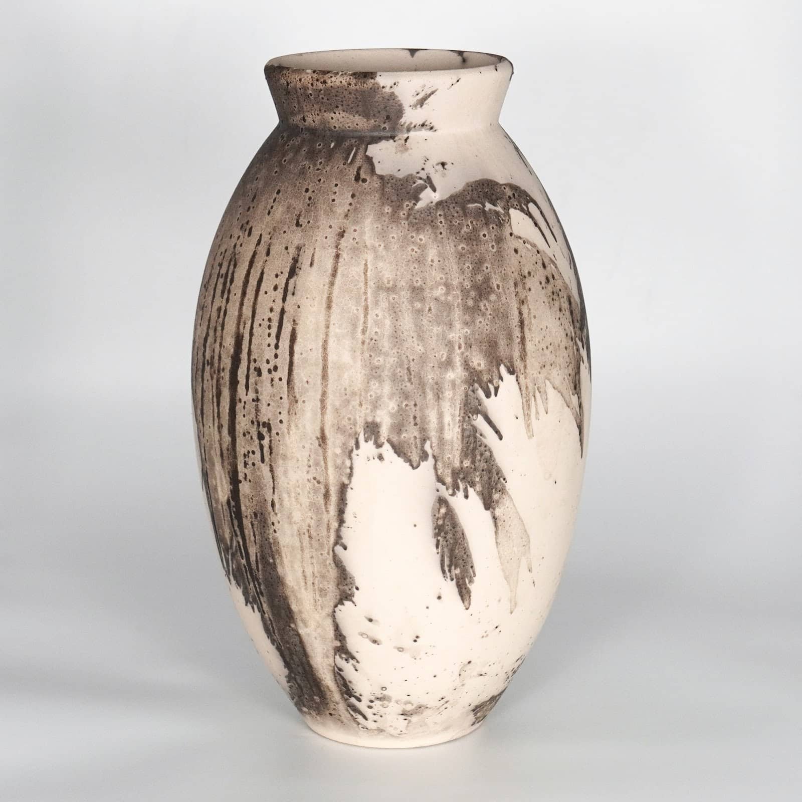 Oval Vase 824 This earthenware vase is created using the Raku firing method, finished with Obvara for a soft, smoky surface effect. The Obvara reaction forms subtle, clouded patterns in warm earth tones that speak of smoke, fire and natural chance. The surface invites close viewing the irregular marks, gentle tonal shifts and textures play with light in a quiet, organic way. Each firing brings variation, making every piece distinct.